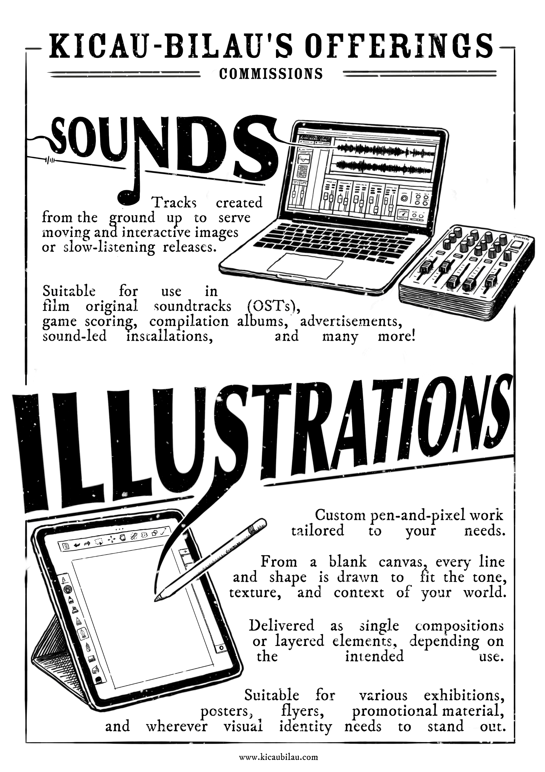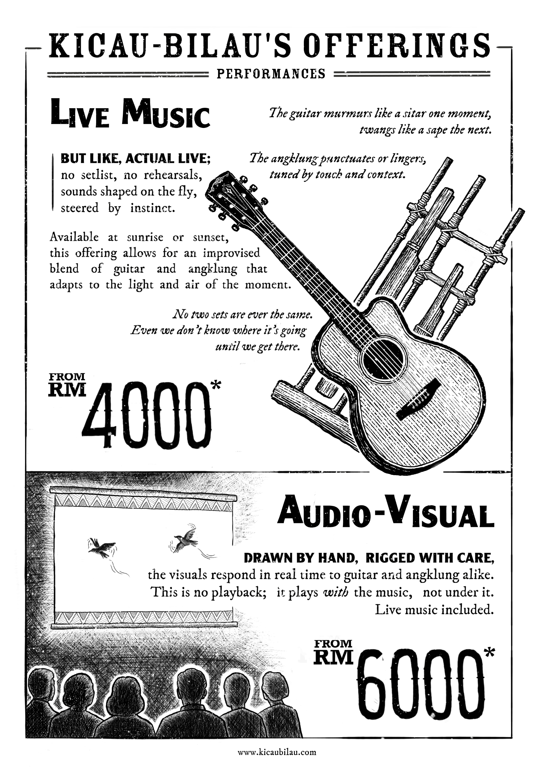 Musically:Kicau-Bilau plays improvisational music, creating spontaneous performances. Each show is unique as Ngerfan and Jihan lets their musical intuition guide them as they explore different rhythms and harmonies. This approach allows them to experiment in real-time, ensuring that no two performances are ever alike.Visually:In processes they call Lakar-Umbi (illustrating) and Tingkah-Lagu (animating), they create intricate layers of digital illustrations that thematically complements the soundscape. Then each layer is arranged and programmed to respond dynamically to the volume, tone, and frequency of each instrument.